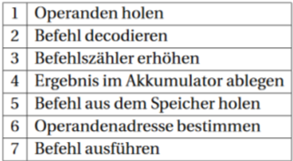 - Execute → Ausführen des Befehls; Schreiben des Ergebnisses in den Akkumulator